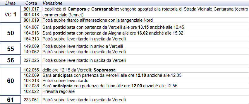 Si avvisa che, per lavori di sostituzione tubazioni, a Vercelli sarà interdetta la circolazione in via Ponti, tratto da corso Libertà a via Palazzo di Città. Pertanto, le corse interessate della Linea: