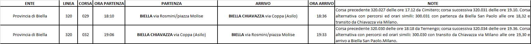 - corsa n. 912: partenza alle ore30 da Biella S. Paolo piazza stazione, una volta giunta in via Carso non svolterĂ a sinistra su via Bertodano ma proseguirĂ diritta su via Carso, via Cernaia, ponte di Chiavazza, via Corradino Sella e percorso normale con arrivo a Biella Pavignano via Piedicavallo/Cimitero alle ore 7.43.