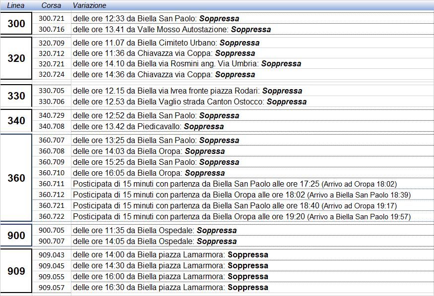 Pertanto, si segnalano le variazioni di percorso sulle varie direttrici: