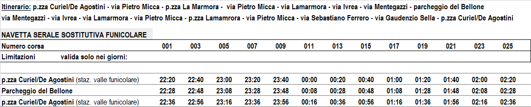 Percorso autorizzato: p.zza Curiel/De Agostini (stazione funicolare) – via Pietro Micca – p.zza Lamarmora – via Pietro Micca – via Lamarmora – via Ivrea – via Mentegazzi – parcheggio del Bellone e viceversa.