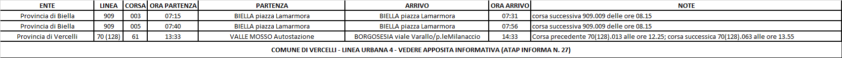 Pubblicato il : 6 February 2026A seguito delle comunicazioni pervenute in azienda nella giornata odierna relative al perdurare dell’indisponibilitĂ di personale viaggiante riferite alla giornata di lunedì 09/02/26, avendo esaurito le scorte di personale abilitato alla guida, ad esito del lavoro di riorganizzazione del servizio finalizzato alla minimizzazione dei disagi all’utenza, si comunica che, fatti salvi ulteriori sviluppi, nella giornata di lunedì 09/02/26 non verranno erogate le seguenti corse ATAP: