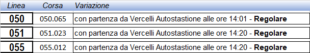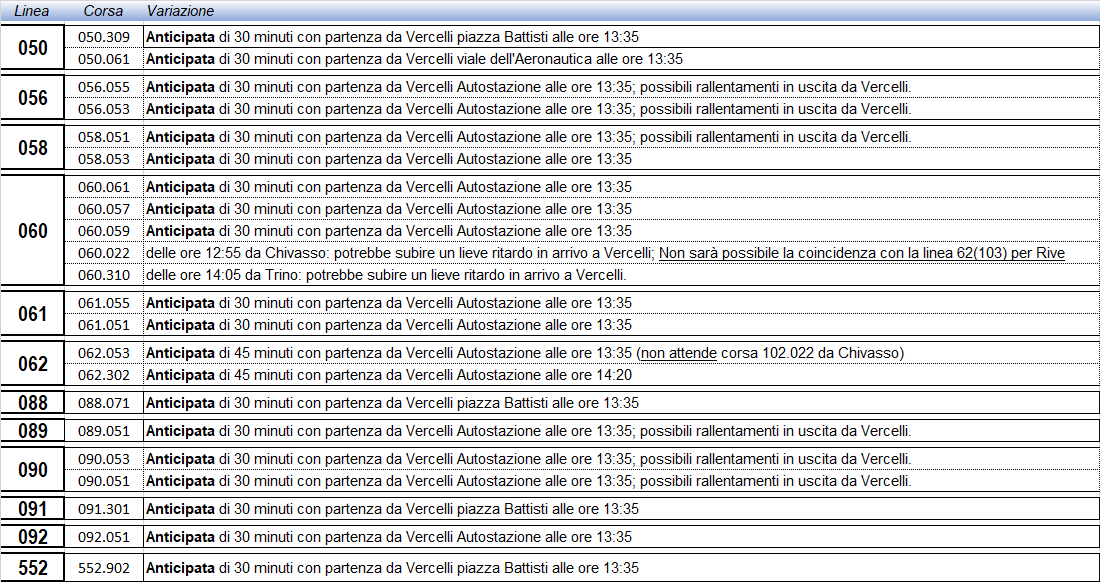 In occasione del passaggio della Torcia Olimpica a Vercelli, previsto dalle ore 13:47 alle ore 14:50, la Questura di Vercelli ha disposto la chiusura anticipata degli Istituti scolastici alle ore 13.30; conseguentemente, su richiesta della medesima Questura, al fine di garantire la partenza dei bus dai vari Istituti scolastici al termine delle lezioni, saranno attuate le seguenti variazioni al servizio con anticipazioni di orario.